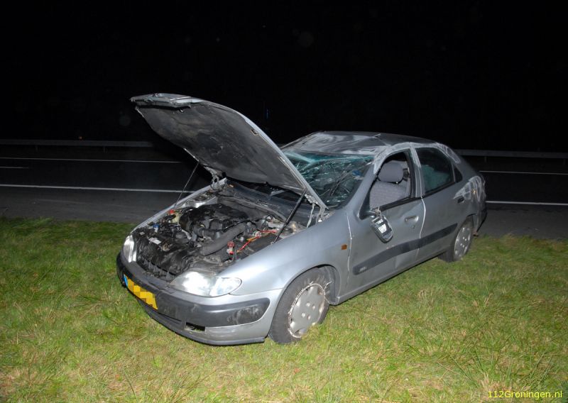 Auto over de kop op de N999 bij Uithuizen