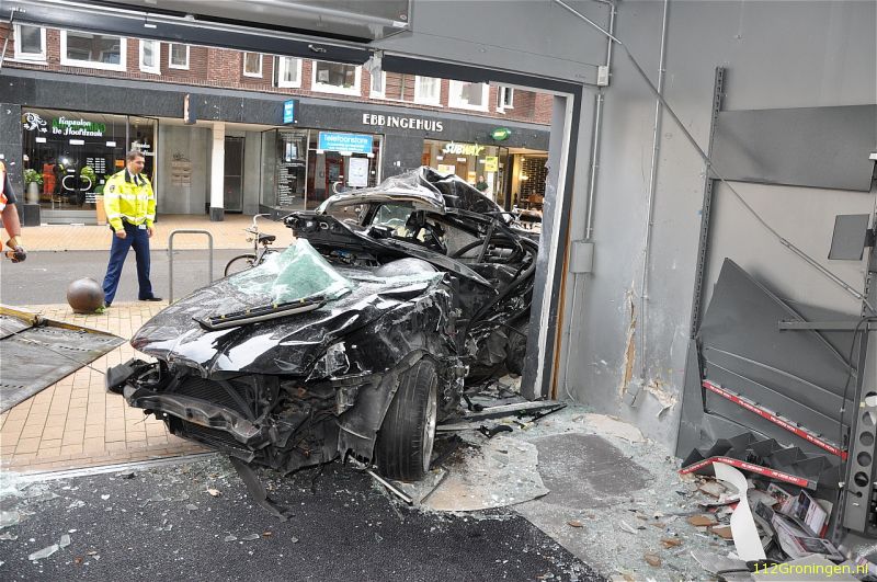Vrijdagavond is een auto op de Hoofdstraat in Stadskanaal over drie betonnen palen heen gereden.