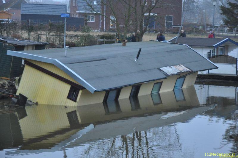 Een woonboot aan de Fivelkade in Appingedam is aan het eind van de vrijdagmiddag gedeeltelijk