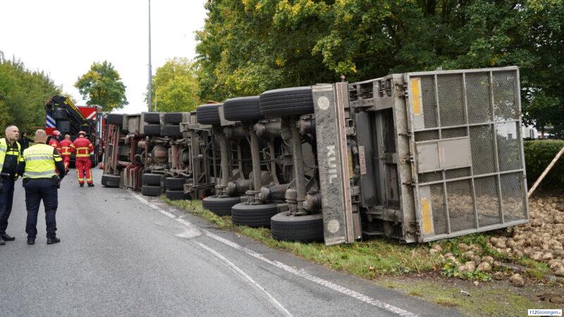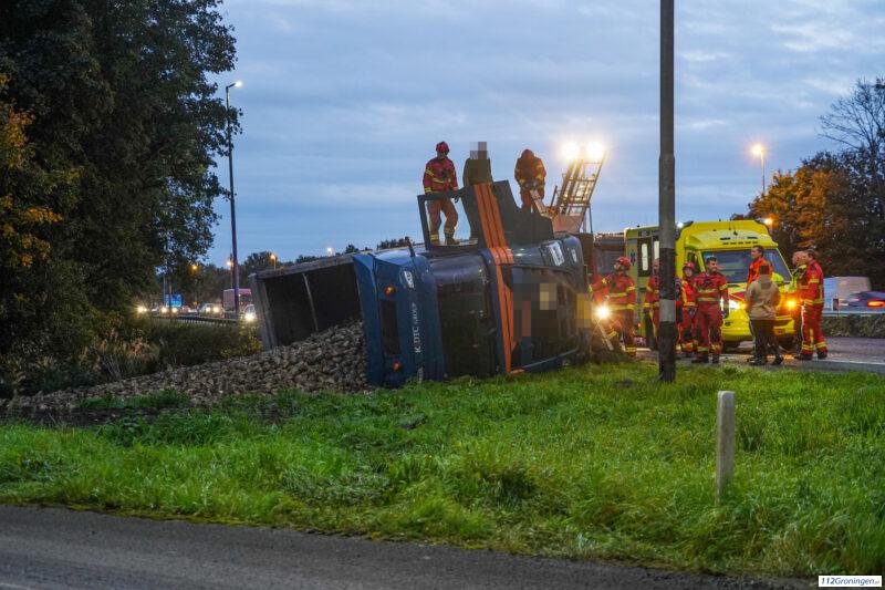 Vrachtwagen gekanteld met bieten op A7 Kolham, chauffeur naar ziekenhuis (update)