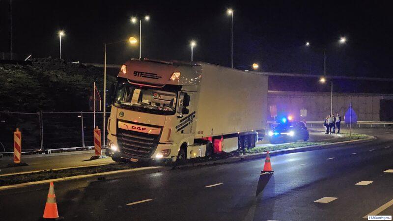 Groningen – Op de Brailleweg heeft een vrachtwagen zichzelf vast gereden in de middenberm. Hierbij