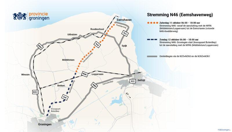 De Eemshavenweg (N46) is in het weekend van 11 en 12 oktober afgesloten in beide