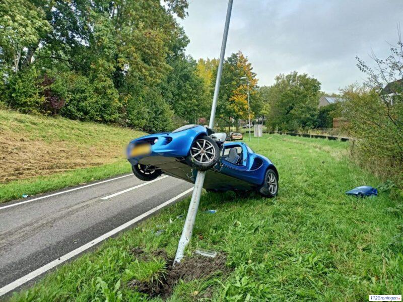Lotus Elise hangt in lichtmast bij Beijum (Video)