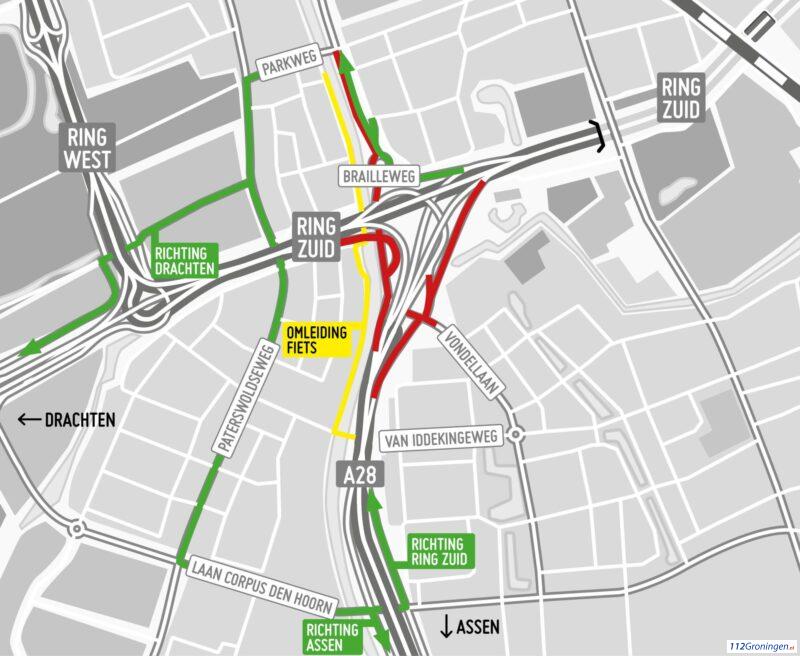 Brailleweg en toe- en afritten Groningen-Centrum dicht