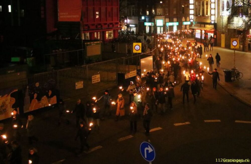 De fakkeloptocht in de binnenstad van Groningen die via social media was aangekondigd kan woensdagavond