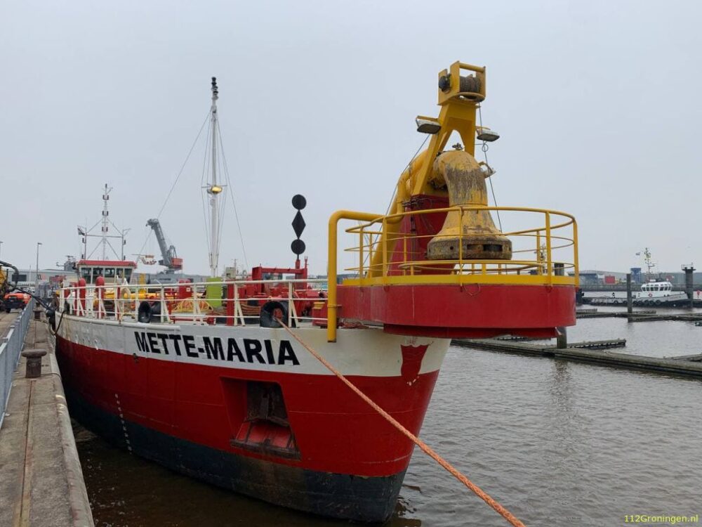 Dit baggerschip lag dinsdag in de Haven van Delfzijl voor een spoedreparatie nadat het tijdens
