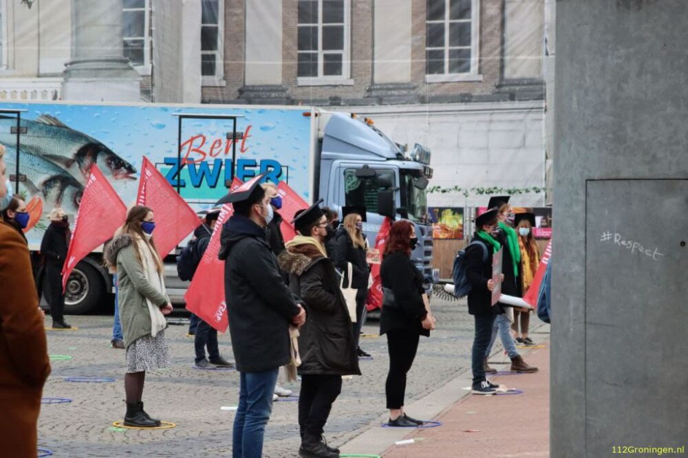 Ruim honderd Groningse studenten demonstreren vandaag tegen het huidige leenstelsel op de Grote Markt in