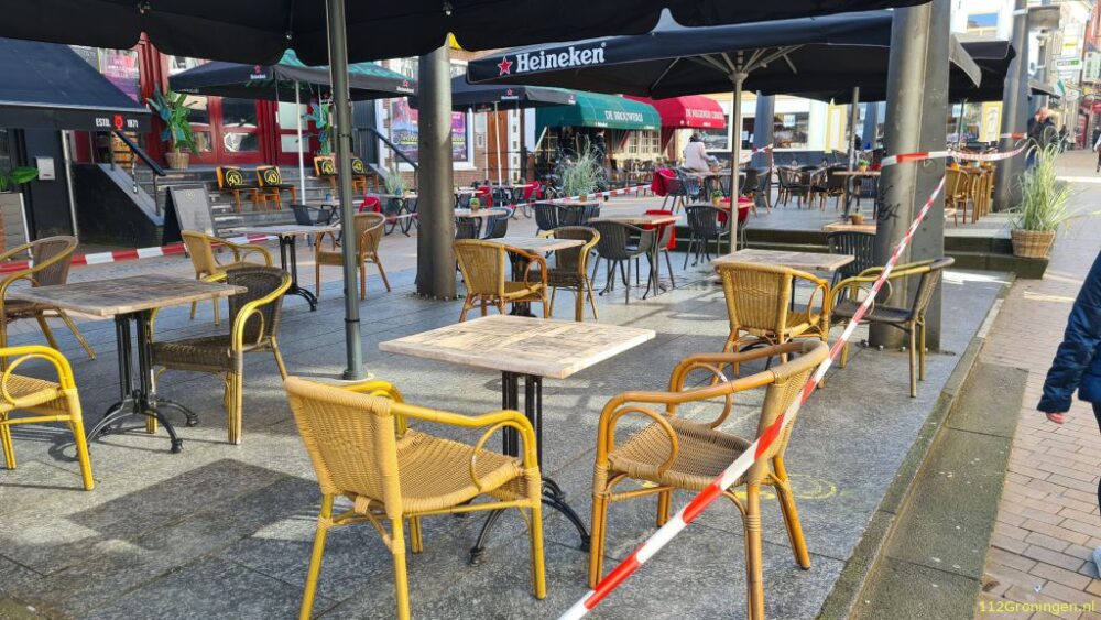 Verschillende horecaondernemers in de binnenstad van Groningen hebben dinsdagochtend hun terras opgebouwd. Dat deden ze