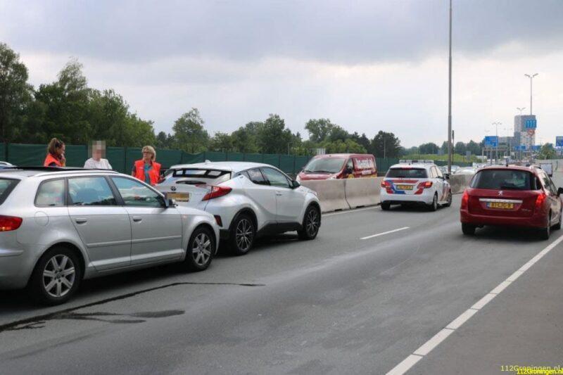 Kopstaart-botsing tussen twee personenauto’s op rotonde Korreweg in Groningen