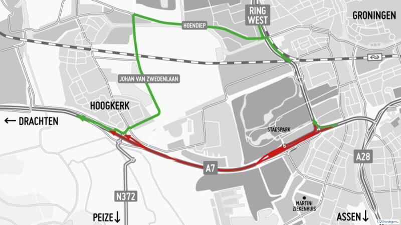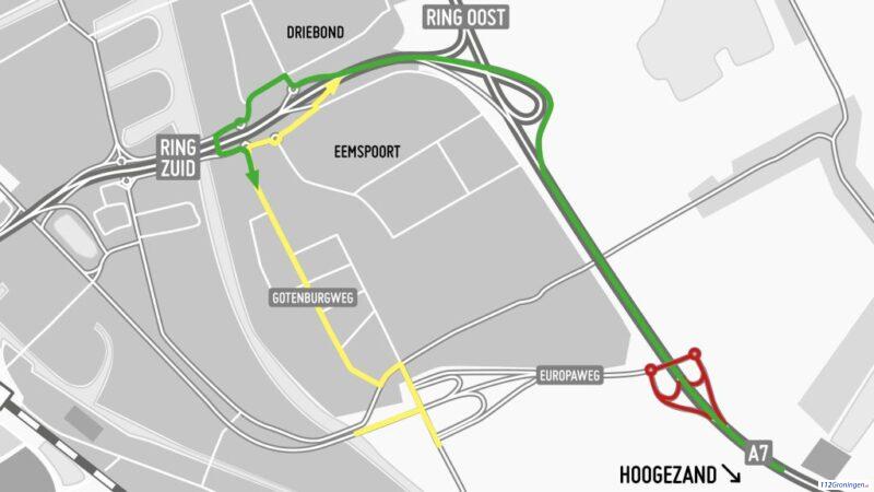 Deel Ring Zuid en A7 richting Hoogkerk dicht