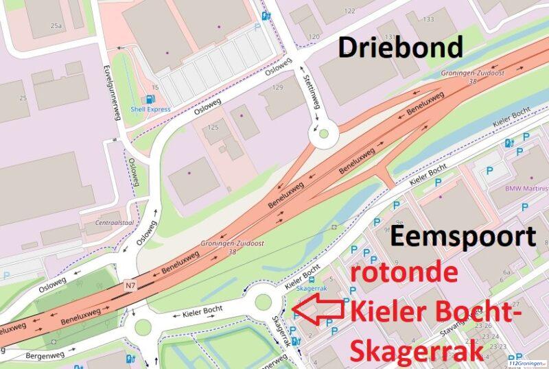 Groningen – Op bedrijventerrein Eemspoort gaan we de rotonde op de kruising van de Kieler