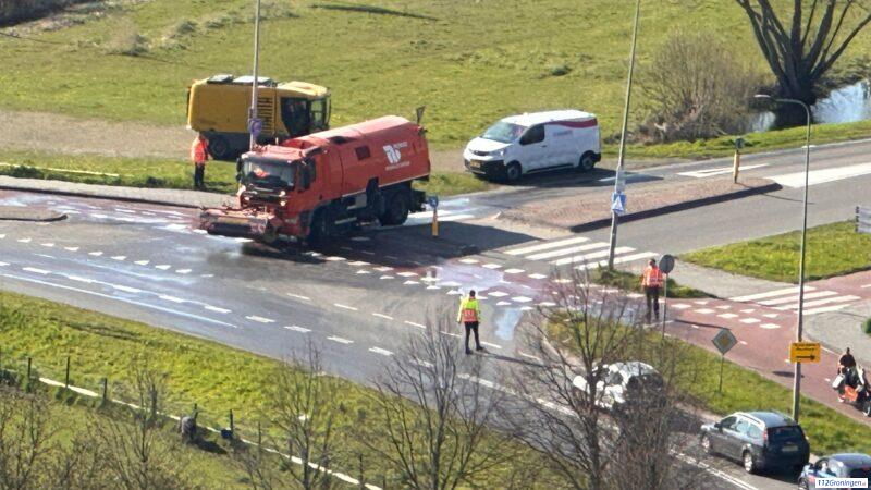 Hoogwerker verliest olie bij Oostersluis, flink oliespoor op wegdek