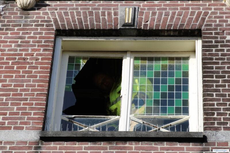 Groningen- Bij Feestcafé klein is een raam gesprongen door de harde wind. De brandweer was