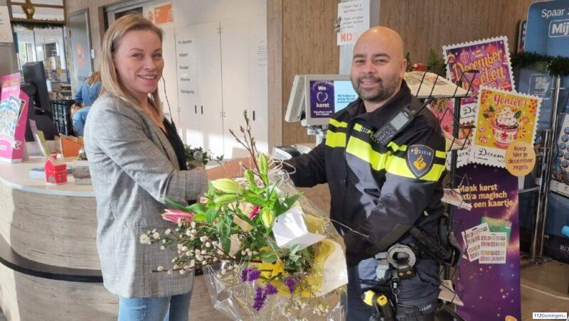 Groningen – Wijkagent Jimmy Salakory overhandigde maandag een mooi bloemetje aan AH-medewerkster Dessa voor haar