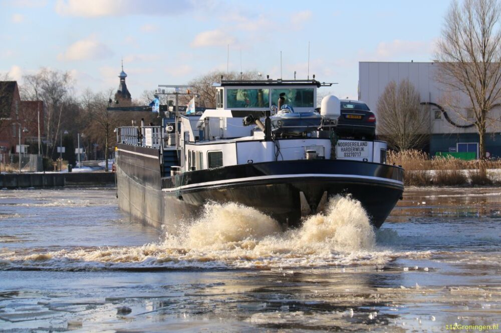 Ijs zorgt voor problemen voor de beroepsvaart in Winschoten. Het vrachtschip kon zijn eindbestemming niet