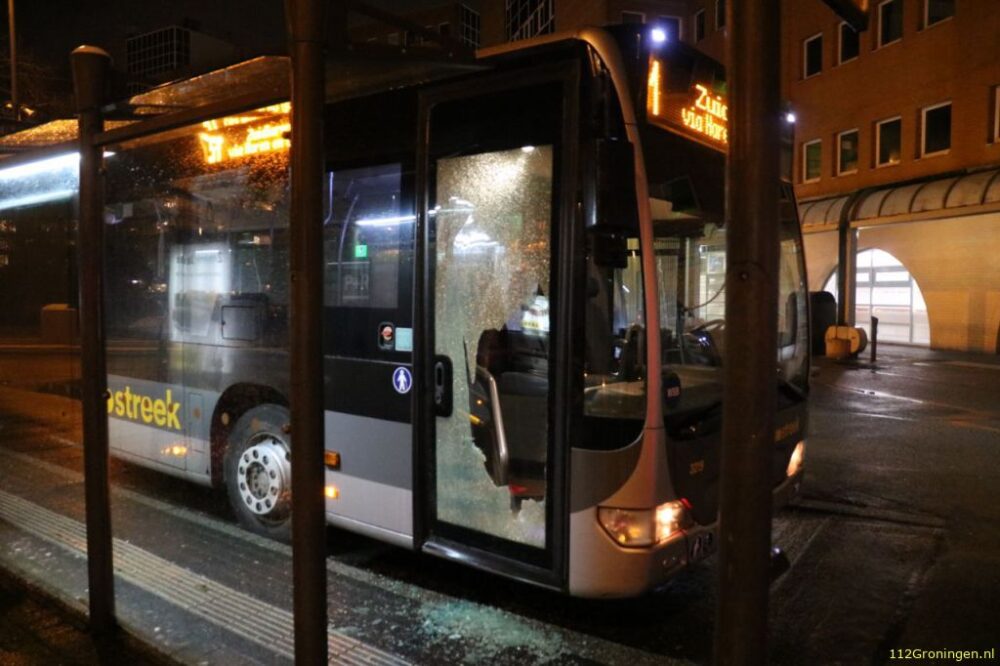 Bij het hoofdstation in Groningen is maandagavond een raam van een lijnbus gesprongen nadat de